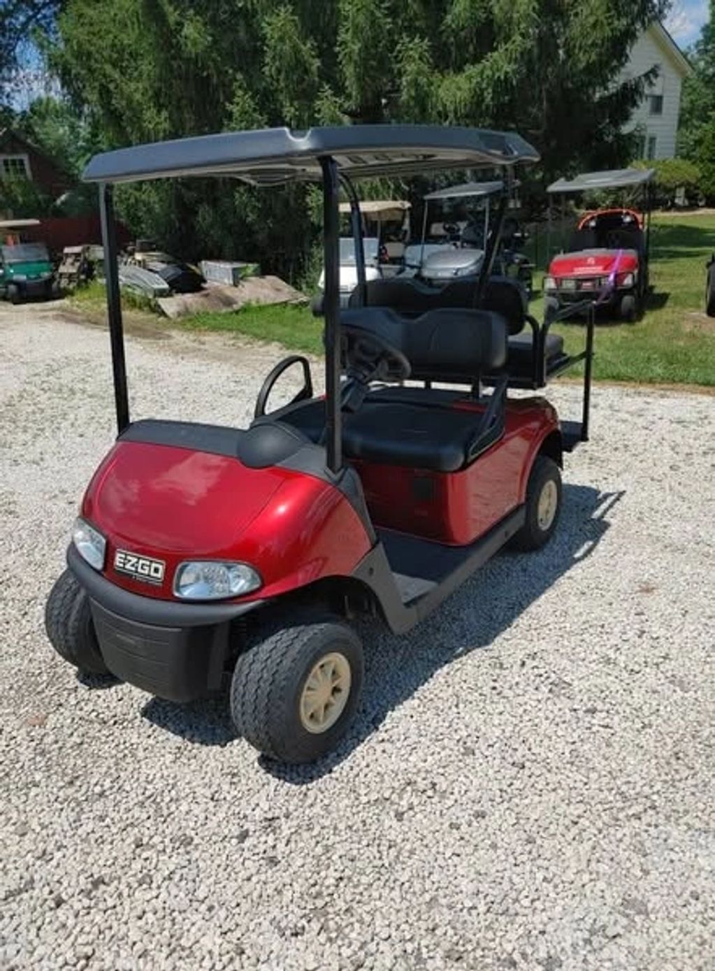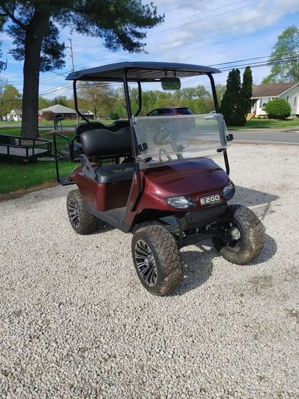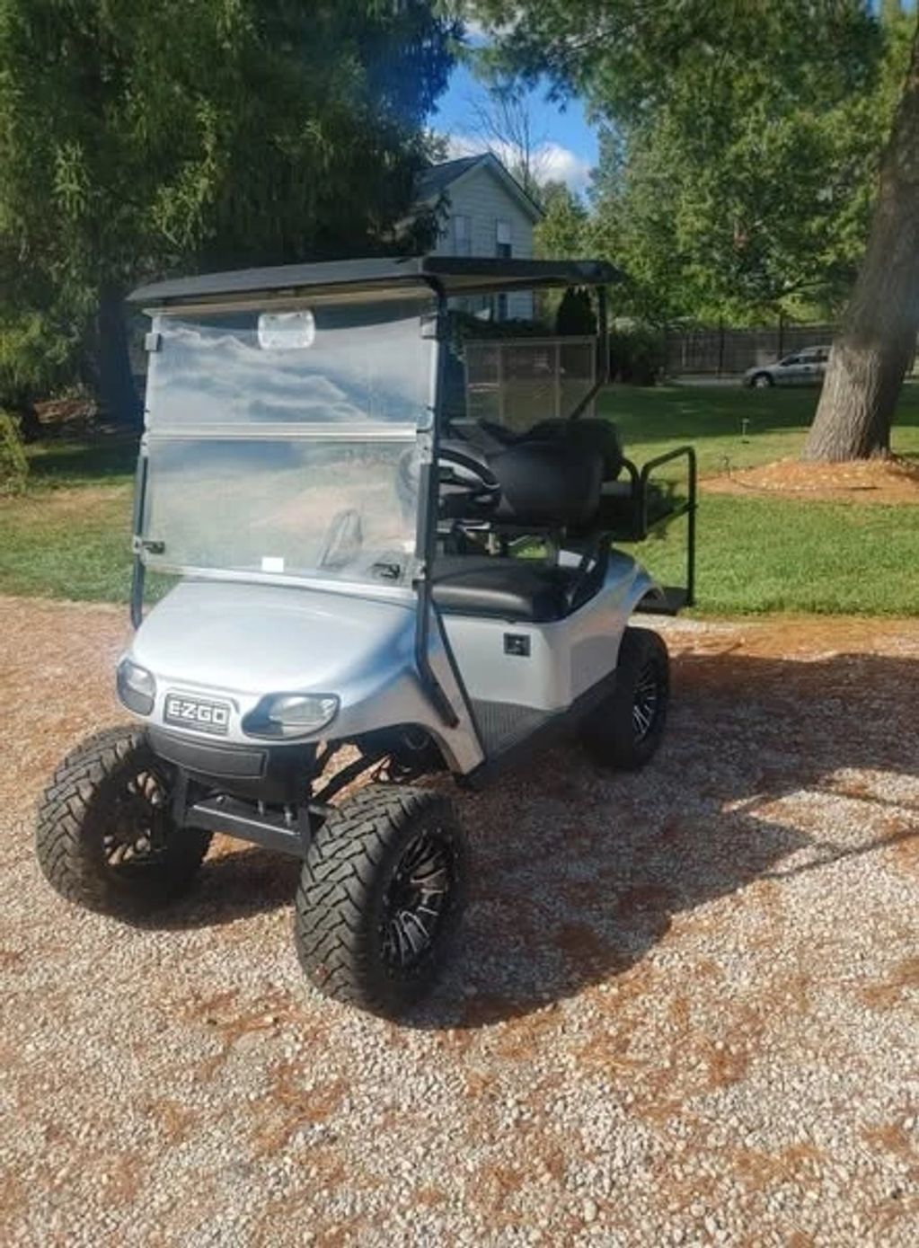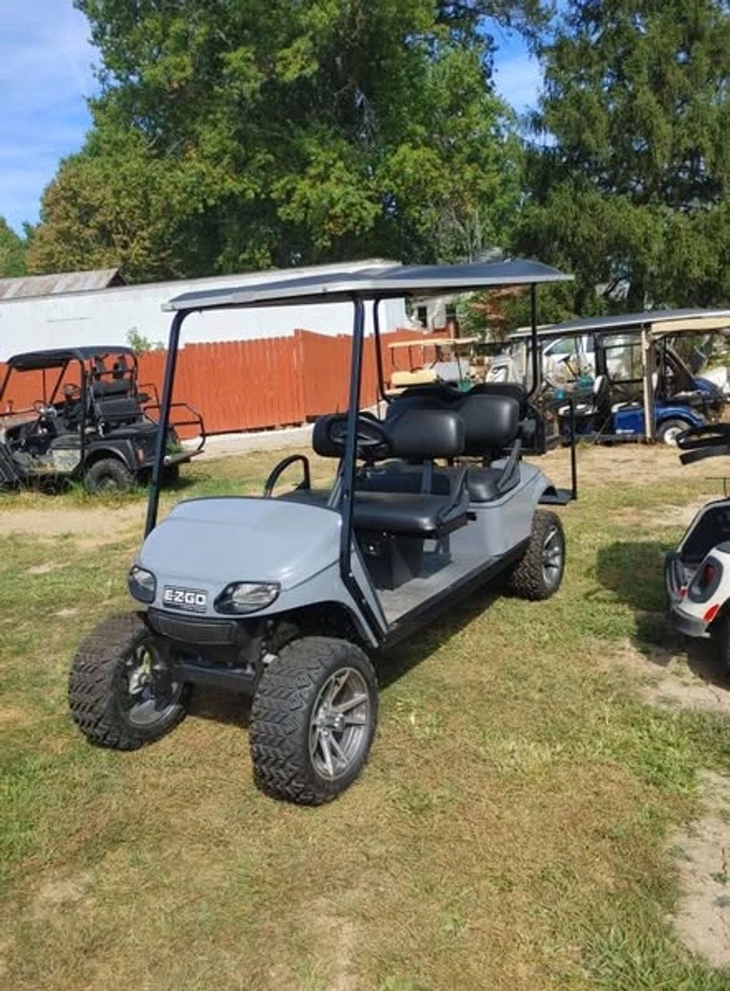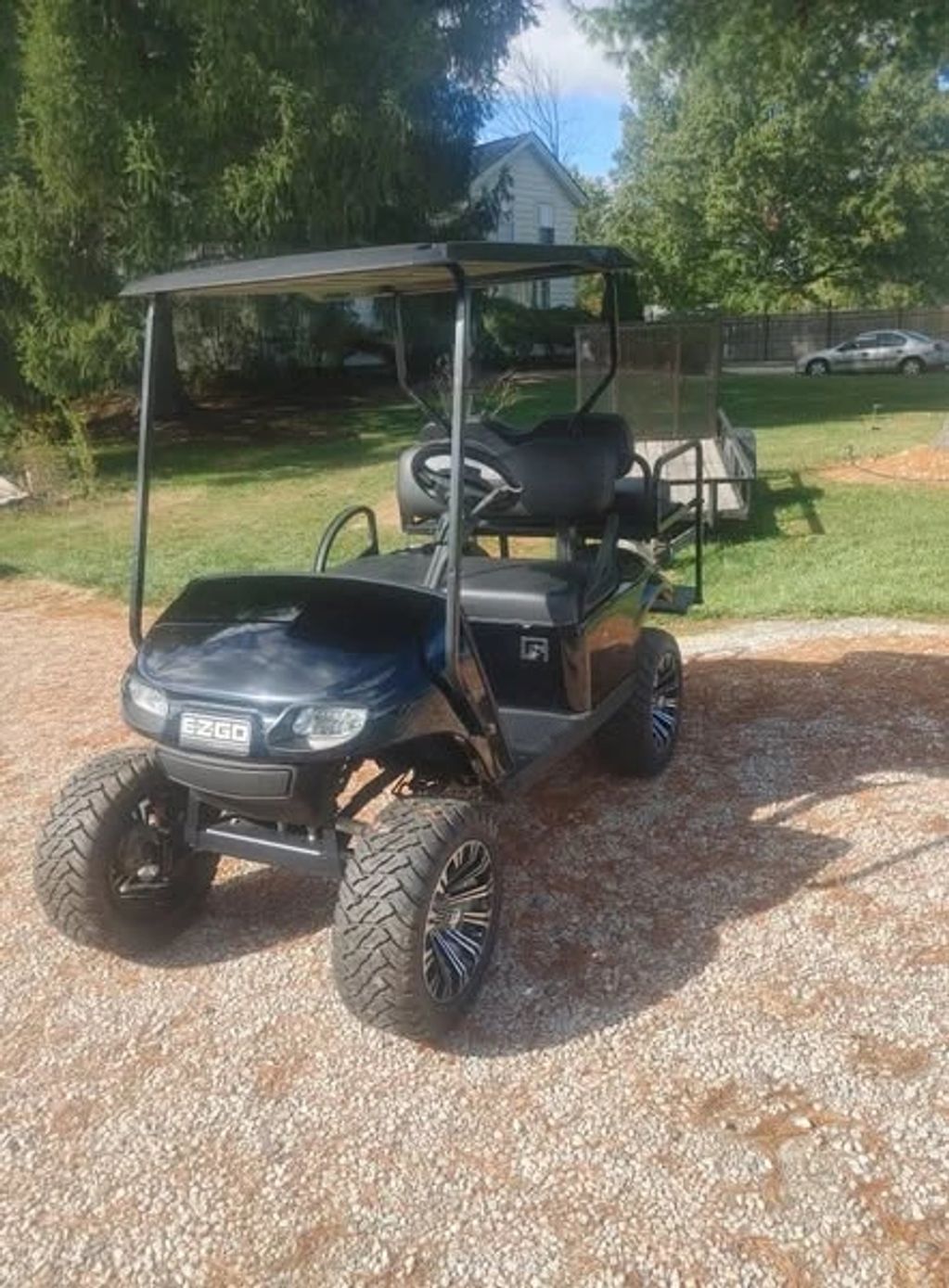 Lift kit, custom wheels , factory ez go grey body, black seats, black extended top, bluetooth speakers, underglow neon lights.